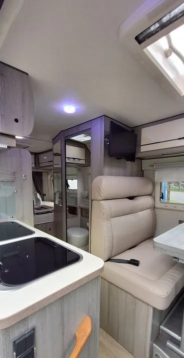 Son implantation optimisée permet d’accueillir jusqu’à 3 couchages, avec un espace salon convivial et une cuisine fonctionnelle équipée d’un grand réfrigérateur et d’une hotte.