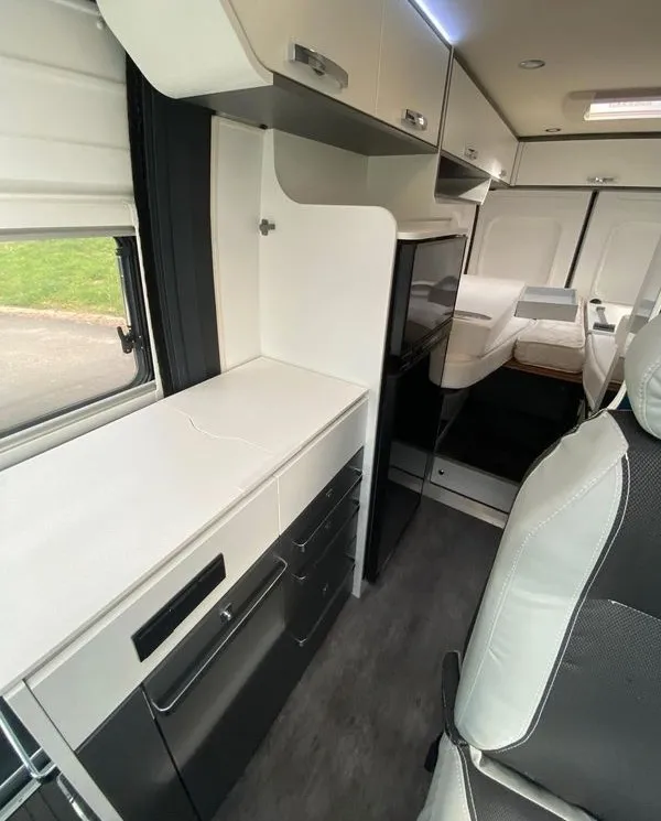 Le salon est composé des sièges cabine pivotants, permettant de créer un espace repas convivial. La cuisine est fonctionnelle et équipée d’un grand réfrigérateur de 138L, offrant une belle autonomie pour les séjours prolongés.