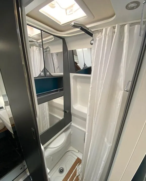 La salle d’eau compacte intègre douche, lavabo et WC, permettant de voyager avec tout le confort nécessaire.